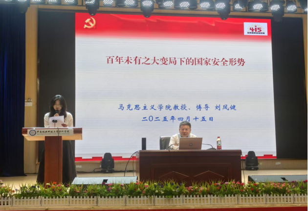刘教授结合党的二十大报告指出,国家安全是民族复兴的根基,社会稳定是国家强盛的前提。在当今世界百年未有之大变局加速演进的背景下,我国既面临着前所未有的发展机遇,也面临着诸多风险挑战。刘教授引用习近平总书记的重要论述:“发展和安全是辩证统一的,没有发展的安全是脆弱的,没有安全的发展是不可持续的。”这一重要论述深刻揭示了发展与安全之间的内在逻辑关系,为我们在新时代统筹发展与安全提供了根本遵循。刘教授呼吁广大师生增强忧患意识,深刻认识到发展与安全的共同重要性。既要坚定不移地推动经济社会高质量发展,提升综合国力,为国家安全奠定坚实的物质基础;又要时刻保持警惕,筑牢国家安全防线,防范化解各类风险挑战,确保国家长治久安。