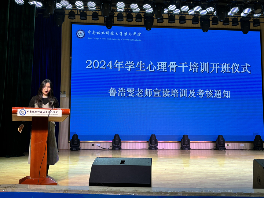 为进一步加强我校心理健康教育工作,增强学生心理骨干的心理健康知识和技能储备,提高工作胜任力,建立健全学生群体心理自助与互助模式,我校学工处心理中心于2024年11月1日中午在学术报告厅举行了“2024年学生心理骨干培训开班仪式”。此次培训开班仪式邀请了学工处负责人甘叶青、二级学院心理专干朱文英、张伊丽、荣婷婷,及心理中心王汪、郭飞、杨雅珺和鲁浩雯出席,2024级各班心育委员、学生心理团队成员及心理健康爱好者共同参训