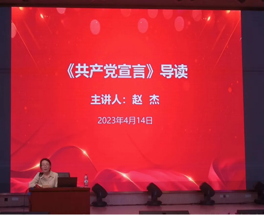 赵杰老师从《共产党宣言》的写作背景和形成过程、重要思想、时代价值三个方面入手,向同学们详细进行了解读,并引用习近平总书记的发言“《共产党宣言》的问世是人类思想史上的一个伟大事件。《共产党宣言》是第一次全面阐述科学社会主义原理的伟大著作。《共产党宣言》是一个内容丰富的理论宝库,做出的理论贡献是多方面的,值得我们反复学习、深深入研究,不断从中汲取思想营养”要求同学们要钻研经典,在经典书籍中不断汲取奋楫前行的力量。