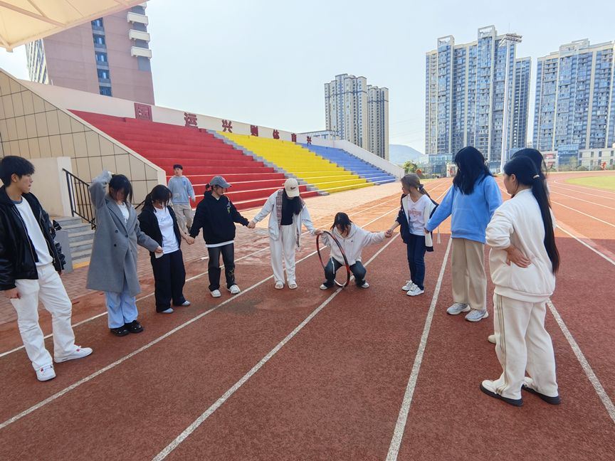 活动伊始,热场游戏“松鼠与大树”迅速点燃了现场气氛。未能成功组队的成员通过自我介绍,分享了作为心育委员帮助他人的暖心经历,通过才艺表演拉近了彼此距离。随后,团队合作环节精彩纷呈:“呼啦圈传递”考验了团队的默契与配合,稍慢的队伍集体完成呼啦圈跳绳,现场笑声不断;“逃脱困境”中,率先完成任务的小组成员积极分享心情调节的方法,将温暖与正能量传递给身边人;“狭路相逢”更是将活动推向高潮,失利队伍手拉手向获胜队伍送上真诚赞美,展现了团队的友爱与包容。活动尾声,全体成员以“爱的抱抱”传递温暖,并共同创意摆拍,留下充满纪念意义的团队合照