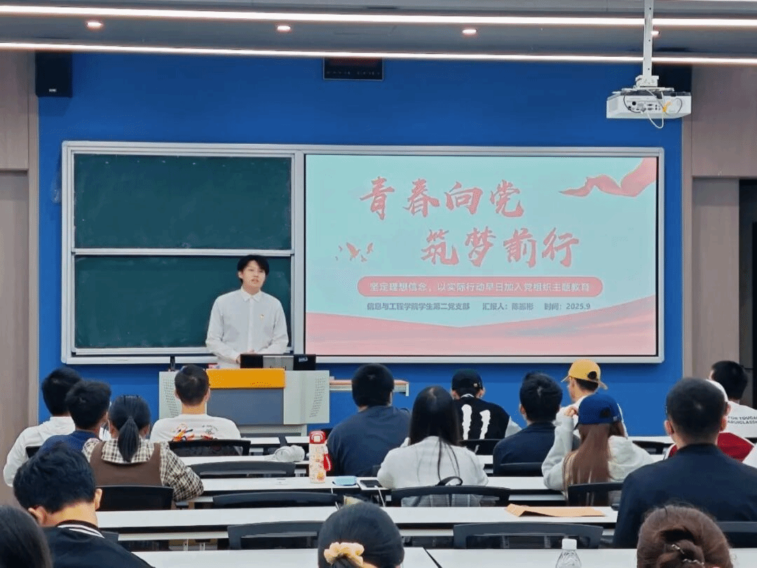 为深化2025级本科新生理想信念教育,将青年学子的政治热情转化为向党组织靠拢的实际行动,2025年10月15日,信息与工程学院党总支精心组织开展“坚定理想信念,以实际行动早日加入党组织”主题党课活动。学院党总支副书记赵梧嵩苑,学生第一党支部书记王玲、学生第二党支部书记陈媛、学生第三党支部书记赵轩民、学生第四党支部书记李玉婷、学生第五党支部书记刘芷伽、学生第六党支部书记李蓉及各支部支委共同参与,为新生们带来一场兼具思想深度与实践指导的“信仰第一课”。