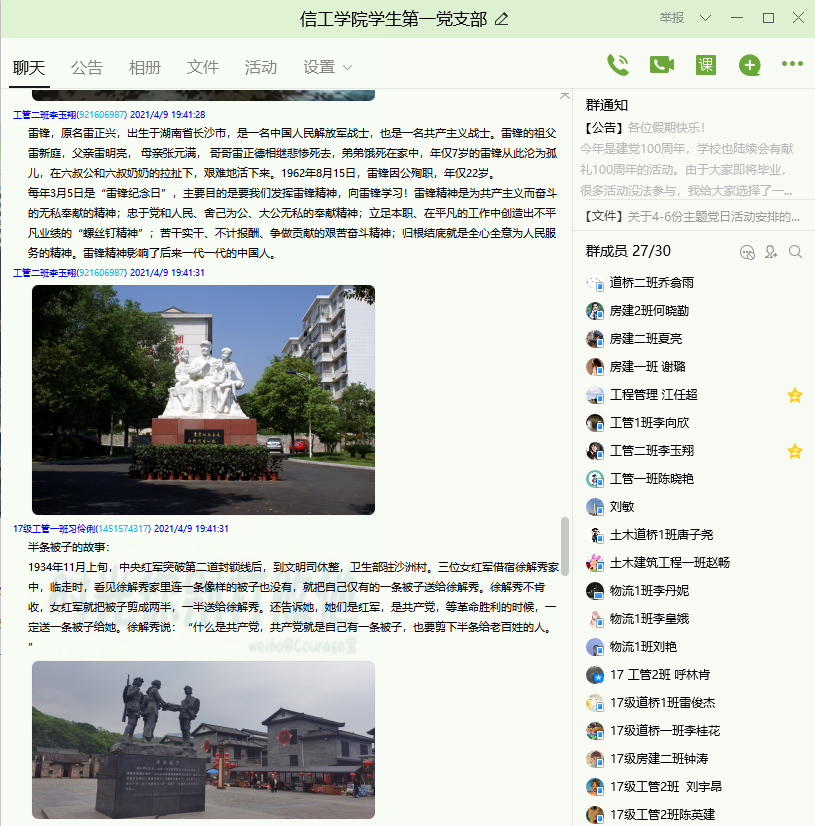 清明祭英烈,哀思悼英魂。2021年4月9日,信息与工程学院学生第一党支部创新开展 “清明祭英烈,共筑中华魂”线上主题活动,全体支部党员通过中华英烈网清明祭主页致敬英烈、祭扫英烈、敬献花篮,随后通过线上座谈会一一分享了黄继光、毛岸英、王震、夏明翰、李文亮、王伟、赵一曼等20余位革命先辈的英雄事迹的英烈事迹,向革命先辈们表达了崇高敬意和缅怀之情。