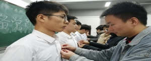 大会第四项,由正式党员给此次接收的预备党员佩戴党徽。