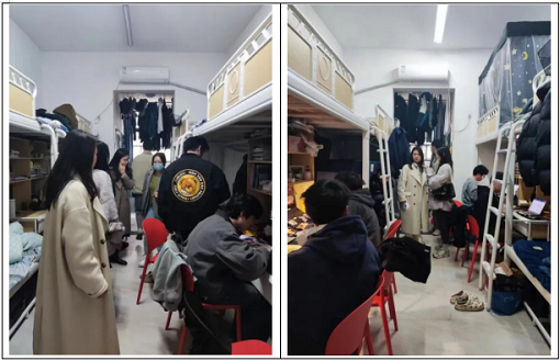 部分宿舍则仍有待改进,电线摆放不规范,垃圾未及时清理,床上堆满物品,地面未打扫干净,存在异味等情况,辅导员对这些宿舍进行了严厉批评并引导他们规范使用电器,及时打扫,时常开窗通风,改善整体宿舍环境,营造一个干净卫生的居住氛围。