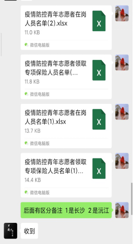 2018级计算机科学与技术二班学生,于疫情期间主动帮助开福区政府志愿者协会统计疫情志愿者人数,制表购买保险。