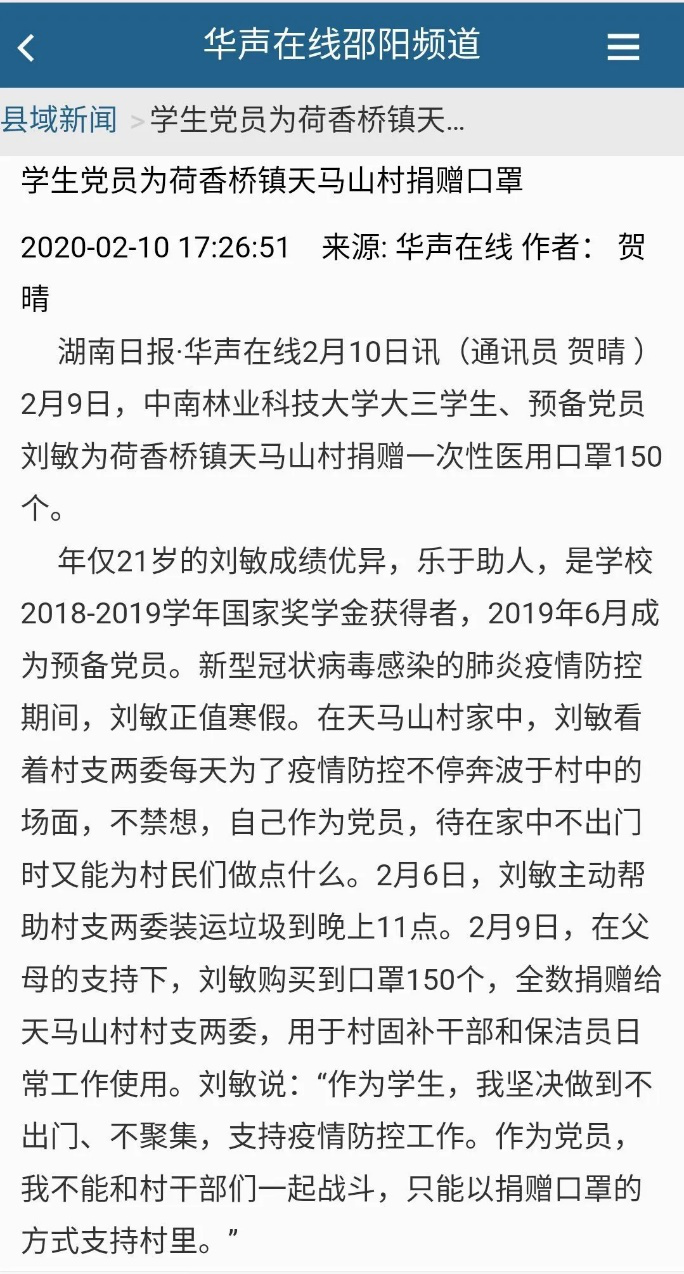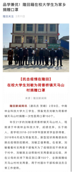 2月6日,刘敏主动帮助村委干部装运垃圾到晚上11点。2月9日,刘敏购买到口罩150个,全数捐赠给天马山村村支两委,用于保洁员日常工作使用。