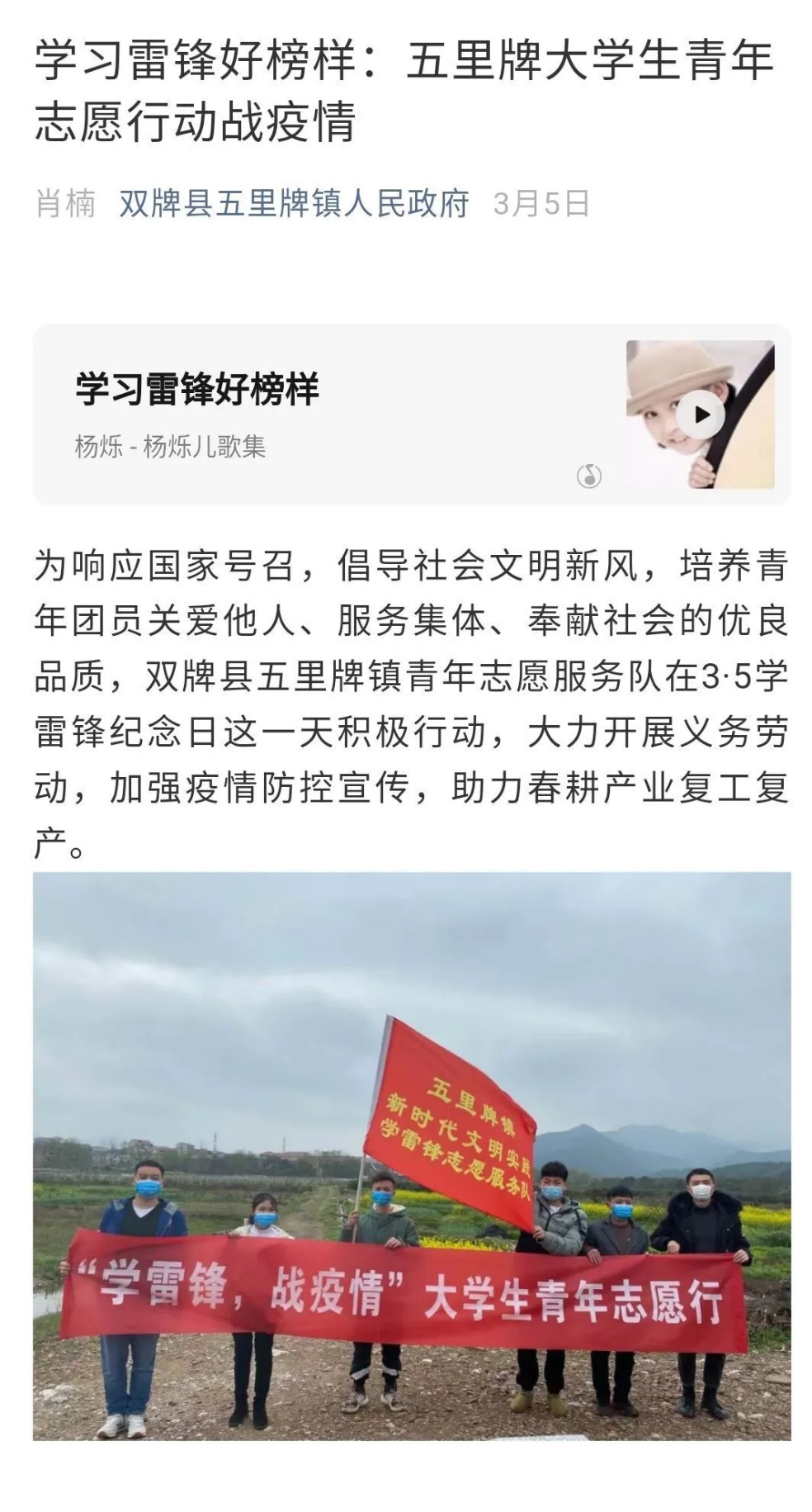 张文文于3月5日参加了双牌县五里牌镇青年志愿服务队举行的大学生青年志愿行活动。