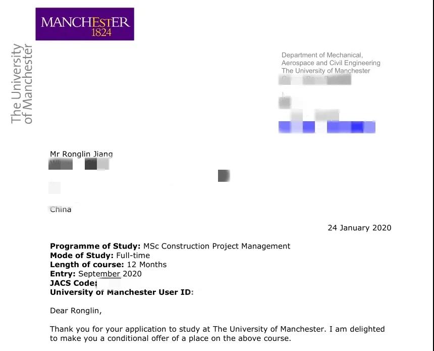 我院2016级工程管理专业蒋荣霖,目前喜获知名大学硕士offer5个,分别是曼彻斯特大学、伯明翰大学、约克大学、兰卡斯特大学和墨尔本大学。曼彻斯特大学:英国著名的六所红砖大学之首,英国罗素大学集团创始成员之一。QS世界大学排名中位居世界第27位,是QS世界30强顶级名校。