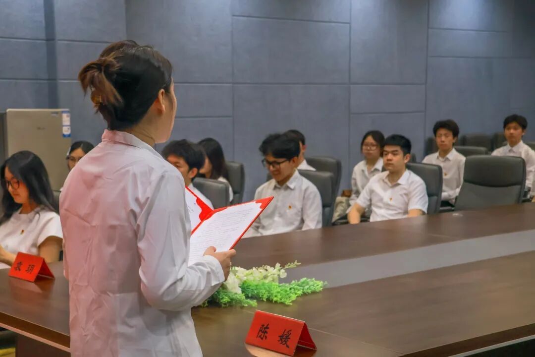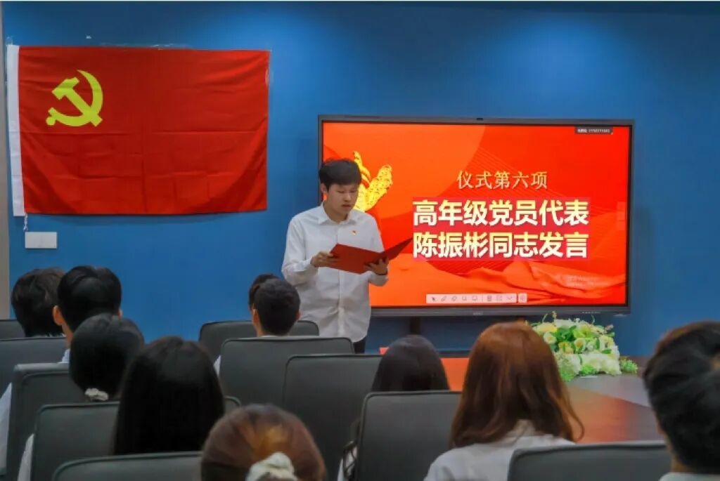 高年级党员代表陈振彬同志结合自身经历,分享了成长感悟,对各位新加入党组织的成员表示热烈的祝贺和欢迎,勉励新党员坚定理想信念,提升政治站位,让信仰明灯长明;同时要加强党性修养,严守党纪党规,坚守道德纪律底线;也要勇于担当作为,发挥先锋模范作用带动身边人,密切联系群众,牢记为人民服务宗旨,关心关爱同学,坚守初心、勇担使命。