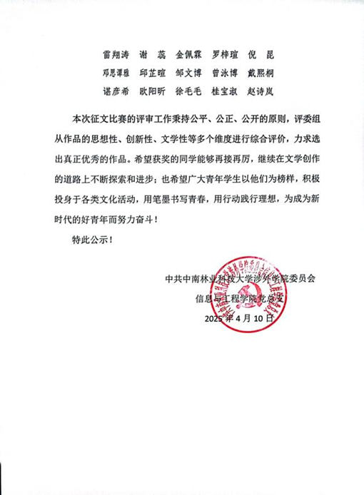 本次初选评审团由信息与工程学院党总支副书记赵梧嵩苑、分团委书记唐敏芝、学生第二党支部书记陈媛、学生第一党支部书记袁玥、学生第三党支部书记赵轩民、学生第四党支部书记李玉婷、学生第五党支部书记刘芷伽、学生第六党支部书记赵雪予和学生第七党支部书记李蓉共同组成,秉承“公平、公正、公开”的原则,从主题契合度、思想深度、语言表达和创新性等多维度对作品进行综合评分。评审过程中,许多作品因“贴近时代脉搏、情感真挚动人”获得高度评价。