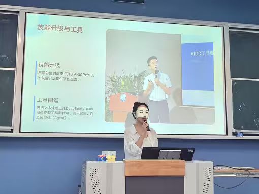 首先,杨佳老师重点分享了AI技术赋能教育创新的培训收获。她详细介绍了如何借助AIGC工具与提示词工程提升工作效率,并表达了成为“懂AI的教育者”的强烈意愿。通过AI赋能课程,她学习了利用技术实现学生数据分析、风险预警和个性化指导的方法,为进一步优化学生管理工作提供了新思路。面向未来,杨老师表示将积极把AIGC技术应用于思政教育、活动策划与个性化学生服务中,同时在育人过程中始终注重情感关怀与创造性培养,坚守教育初心。