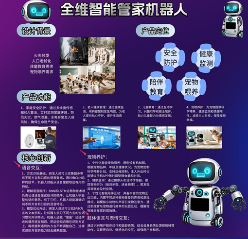由信息与工程学院李生才老师指导,胡春桂、周慧珍同学完成的作品《全维智能管家机器人》荣获全国二等奖。该作品集安全管控、养老辅助、儿童教育、宠物照料及娱乐休闲等功能于一体,具备多设备联动、家庭风险智能排查等核心能力。机器人“小维”采用拟人化设计,搭载呼吸灯光、柔性表情屏、自适应语调和全维感知系统,实现了更自然、更温暖的人机交互体验。