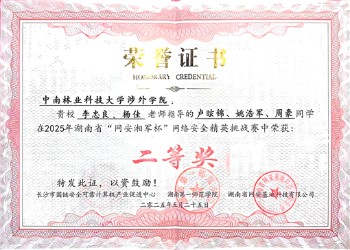 网络安全是国家安全的重要基石,随着数字化进程加速,实战型网络安全人才需求日益迫切。希望更多中南林涉外信工学子能增强网络安全意识,以赛促学、精进技能,在未来的竞赛中再创佳绩,为湖南省网络安全产业发展贡献力量,为建设网络强国、数字中国添砖加瓦!