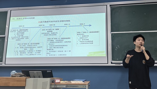 为切实缓解2026届数据科学与大数据技术专业学生的就业焦虑与成长困惑,信息与工程学院于2025年3月13日在智信楼436成功举办了针对该专业毕业生的系列未来计划动员会。本次动员会聚焦职业发展痛点,通过学业规划与心理疏导,有效消除了学生的认知盲区,疏导了发展焦虑情绪。信息与工程学院副院长杨露、党总支副书记赵梧嵩苑、院长助理李忠良、分团委书记唐敏芝以及数据科学与大数据技术专业辅导员向利丹老师、刘芷伽老师出席动员会,全体2026届数据科学与大数据技术专业毕业生参加会议。会议由大数据专业教师黄中英主持。