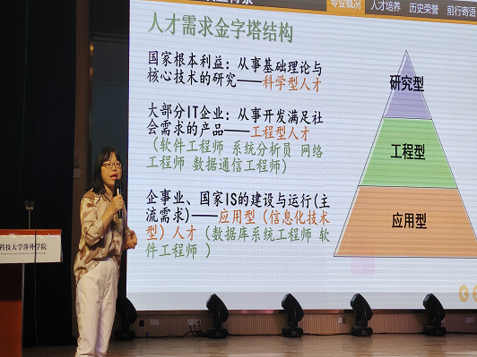 软件工程教研室刘敏老师首先以才人金字塔结构引入话题,勾起大家的兴趣,然后深度讲解软件工程专业,并介绍了经验丰富的师资队伍,让大家对本专业充满了信心。