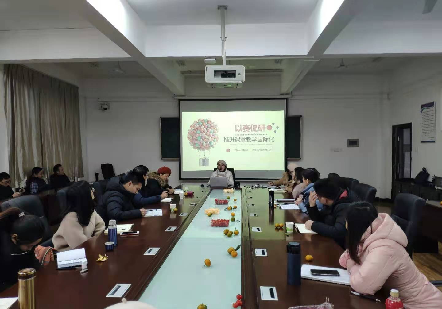 其次,数学教研室的郑彭丹老师做《以赛促研,推进课堂教学国际化》的研讨。从课堂教学竞赛简介;以赛促研、以赛促教、以赛促学;课堂教学国际化的角度分享讲课竞赛的经验。