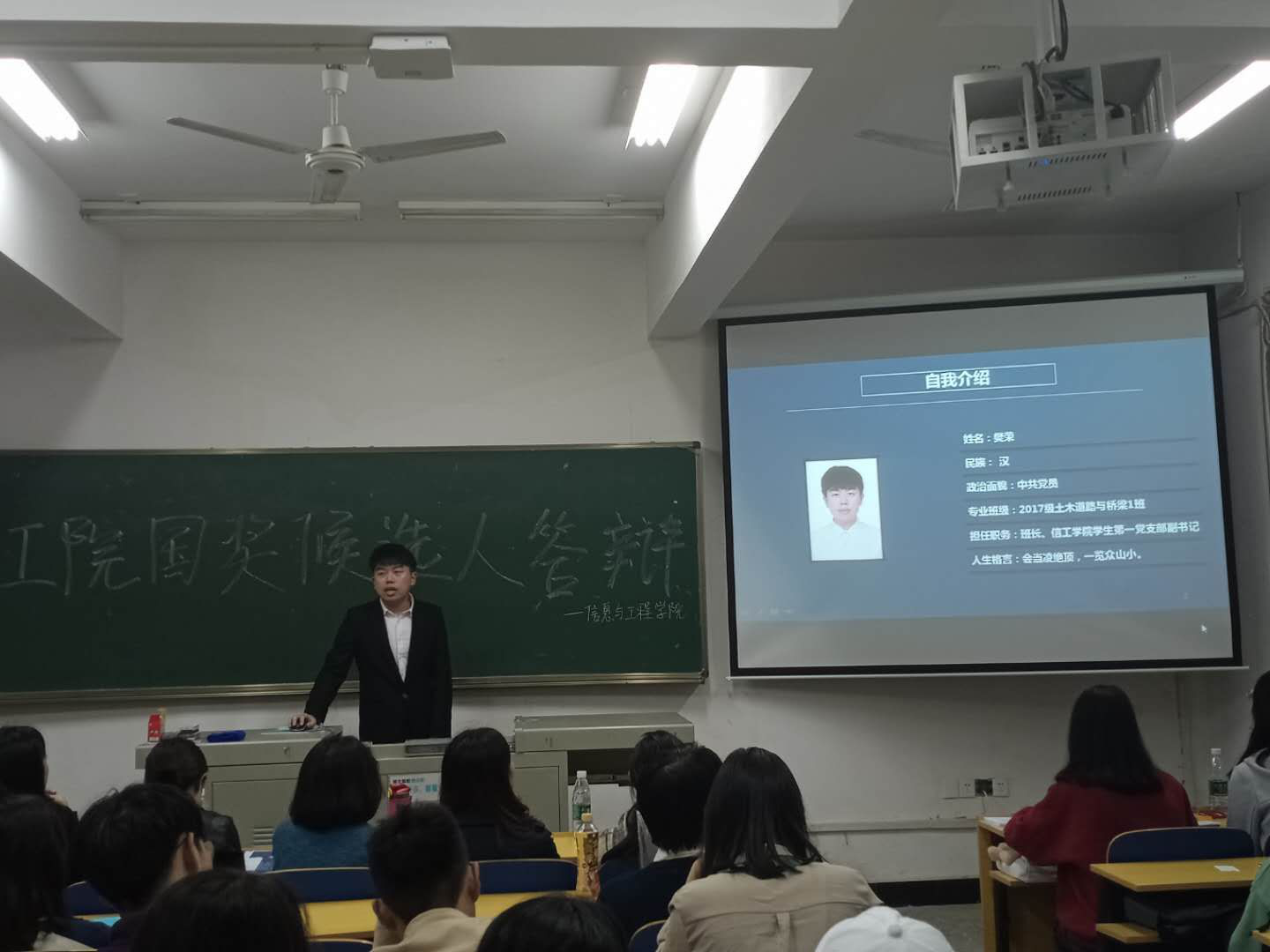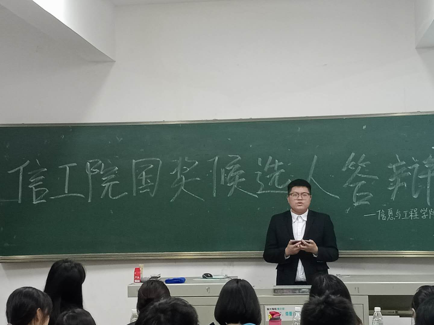 为激励学生勤奋学习、努力进取,并评定出德智体美劳全面发展的国家奖学金获得者。10月14日下午14:30,信息与工程学院在2101教室举行2020年秋季学期国家奖学金答辩会,信息与工程学院党总支书记潘舒群老师,团总支书记甘甜老师,辅导员陈媛老师、付存婕老师、钱梦婷老师、赵轩民老师出席了此次答辩会。