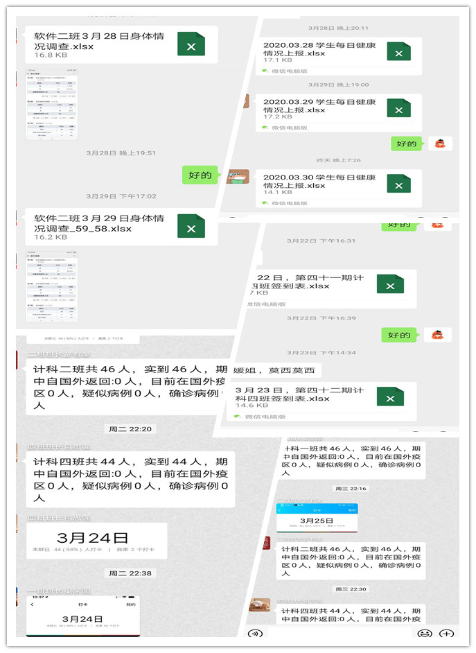 我院辅导员们及时完成学校、院系布置的工作任务,自1月26日开始,我们每日摸排学生情况,全面掌握学生的健康状况,利用微信QQ电话短信多种方式一对一联系学生,向学生做好防疫知识宣传和防护教育,重点关注疫区学生,掌握其行动轨迹,安抚学生居家焦虑;从最开始的接龙签到,回复身体状况信息截图,QQ签到地理位置,到现在略有成效的每日一签问卷调查,感恩同学们每一次的填写每一次的收到。对于疫情防控工作,信工的辅导员们也越来越得心应手。
