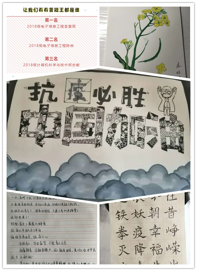 为把习近平总书记关于应对新冠状病毒肺炎疫情工作的重要讲话精神和省委、省政府疫情防控工作的讲话精神落在实处,信工辅导员们积极推荐和宣传我院举办的共抗疫情,爱国力行的系列活动,努力做到思想宣传不脱节,同学们积极参加线上防疫知识竞赛,创作诗歌、绘画、书法、视频等作品,助力防控战疫情,深入推进爱国主义教育,弘扬爱国主义精神,展现信工学子的责任和担当。