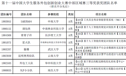 “中国大学生服务外包创新创业大赛”是由教育部、商务部和无锡市人民政府联合主办的全国性创新创业大赛,与“互联网+”、“全国大学生电子设计竞赛”、“数学建模”、“节能减排”等一道属于教育部主办的A类赛事。该赛以应用为导向,加强产学互动,吸引企业关注学生创新创业,促进教育教学改革适应战略性新兴产业发展,提高人才培养质量。该赛采取企业命题(A类)和创业实践(B类)选题两种方式,要求不多于5人一组。企业命题选手需在规定时间内,根据企业所提供的技术条件,完成设计开发和制作任务,提交作品等;B 类侧重创业实践,要求参赛项目已经取得一定成效。