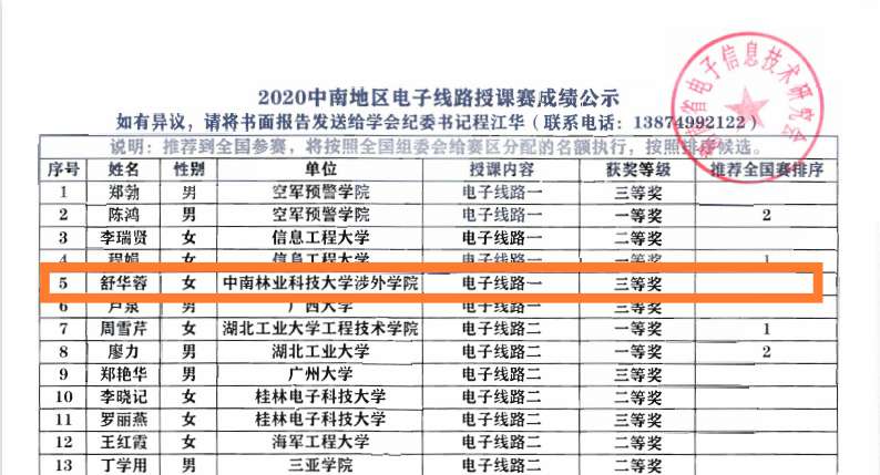 舒华蓉老师在第三届全国高等学校青年教师电子技术基础、电子线路课程授课竞赛中荣获中南赛区三等奖的佳绩。