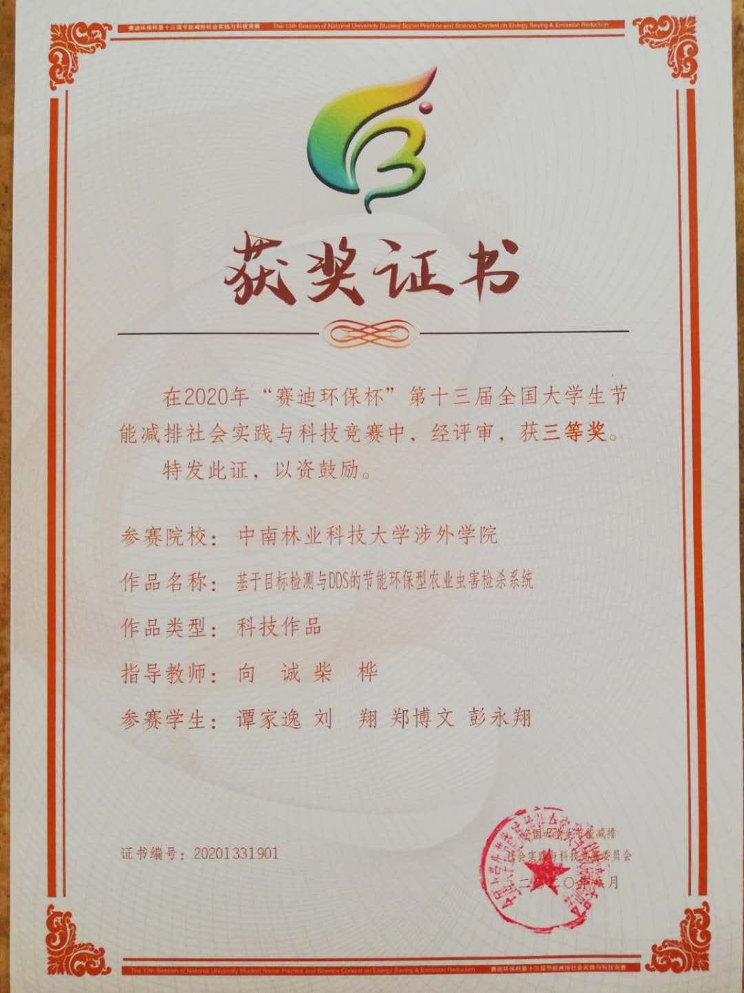 8月30日,“赛迪环保杯”第十三届全国大学生节能减排社会实践与科技竞赛在重庆大学落下帷幕。由我院向诚副教授、柴桦老师指导2017级电子信息工程专业学生谭家逸、刘翔、郑博文、彭永翔四位同学设计制作的“基于目标检测与DDS的节能环保型农业虫害检杀系统”与清华大学、中国科学院大学、华中科技大学、电子科技大学等国内“双一流”大学的参赛学生同台竞技,荣获科技类作品全国三等奖的好成绩。这是该队伍继六月“中国大学生服务外包创新创业大赛”获奖后再获佳绩。