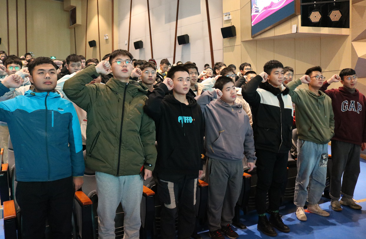 学生代表李婷婷上台带领全体学生进行诚信考试宣誓:自觉遵守考试纪律,公平参与考试竞争,珍惜名誉,诚信做人。