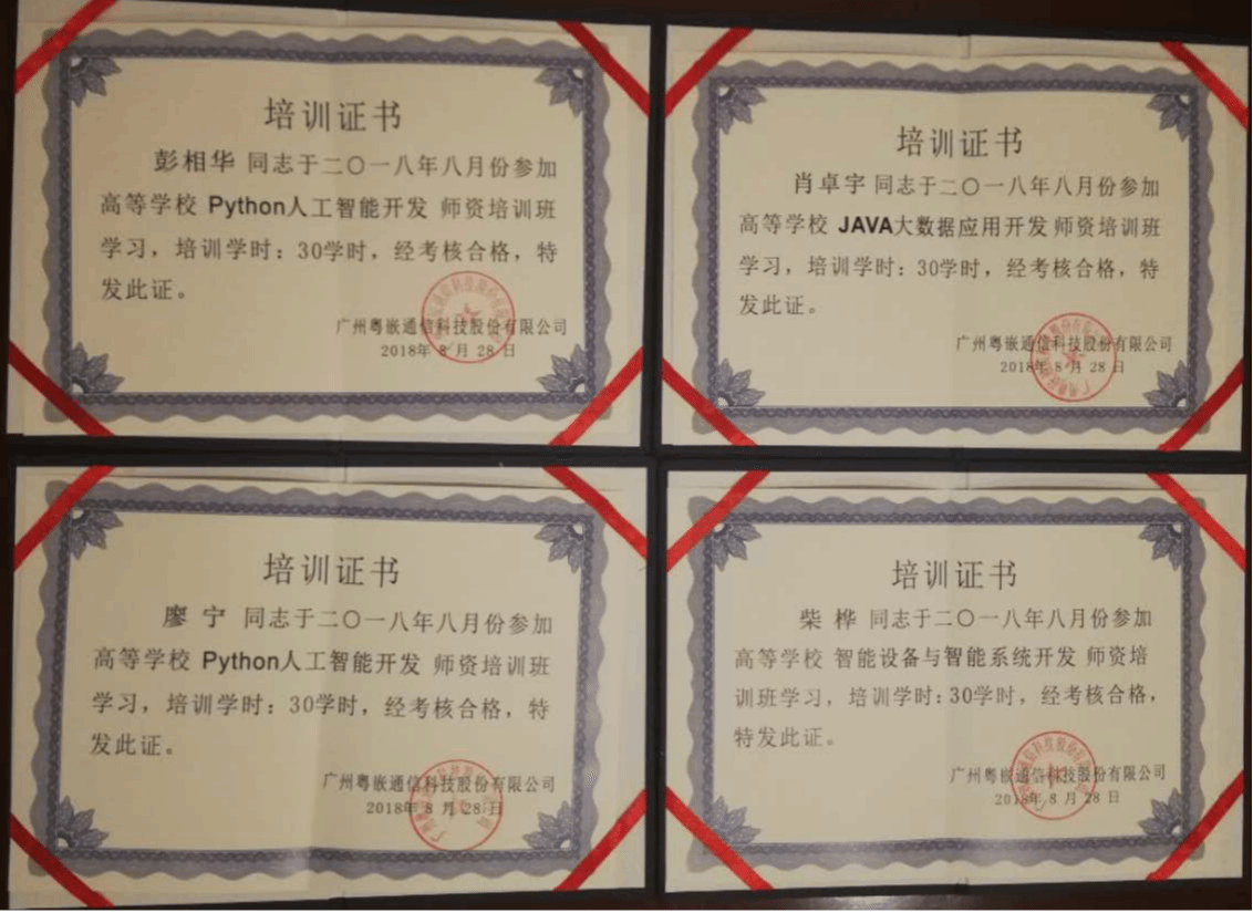 培训内容分三个方向,彭相华和廖宁老师参加了Python人工智能开发师资培训班,肖卓宇老师参加了Java大数据应用开发师资培训班,柴桦老师参加了智能设备与智能系统开发师资培训班,四位老师顺利通过考核,并获得培训证书。