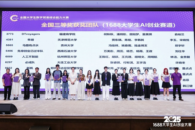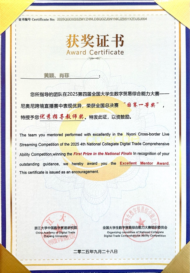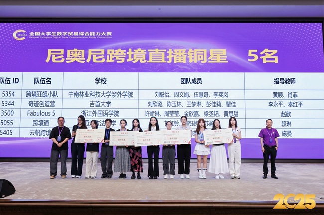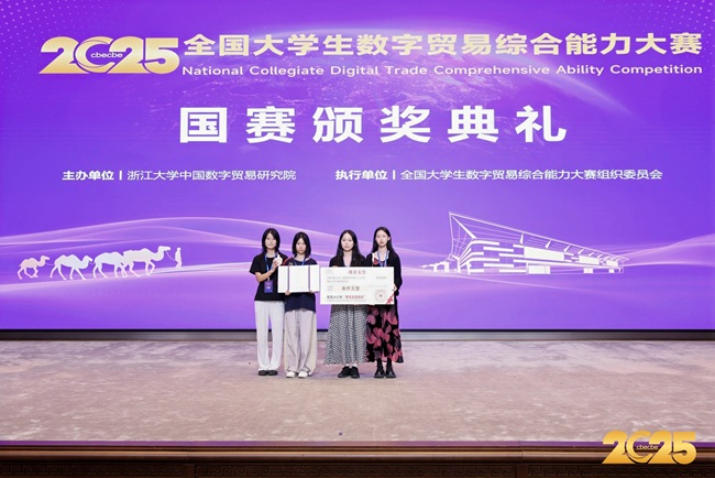 9月28日,第四届全国大学生数字贸易综合能力大赛全国总决赛圆满落幕。我院学子与浙江大学、中南大学等全国知名高校选手同场竞技,凭借扎实实力脱颖而出,交出亮眼答卷。其中,由国际经济与贸易专业及英语专业学生周文娟、伍慧奇、李奕岚组成的团队,在尼奥尼跨境直播赛道表现尤为突出,不仅携手斩获该赛道全国一等奖,更同步拿下 “铜星” 称号;国际经济与贸易专业学生黄梦鹭、李萌、张慧奕组成的团队,则在 AI 创业赛道稳健发挥,成功摘得三等奖,多维度展现我院学子的专业素养与实战能力。