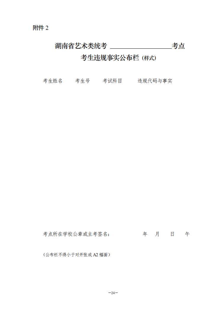 (三)切实加大对违规行为的查处力度。要加强考生身份核查,杜绝代考、换卷等严重违规事件的发生;要加大考风考纪监察力度,在醒目位置设立举报箱、公布举报电话,严厉查处弄虚作假、徇私舞弊者。要按照《湖南省普通高校招生考试考生违规行为认定及处理程序》(见附件1)的规定做好对违规考生的处理,并在当场考试结束后,立即在公布栏张榜公布考生违规事实(附件2);有关违规考生的记录表、名册(见附件3)、证据材料和公布栏缩印件,必须在考试结束后一天内报送我院纪检与督查处。对于考生、工作人员及考点学校的违规行为,将严格按照《国家教育考试违规处理办法》《普通高等学校招生违规行为处理暂行办法》《事业单位工作人员处分暂行规定》《中华人民共和国公职人员政务处分法》等规定严肃处理。我院将建立艺术类统考考点退出机制,凡存在工作人员严重违规、考试管理混乱等违规行为的考点学校,视情节轻重,责令整改或取消该校下一年度的考点资格,并按规定追究相关单位和人员的责任。