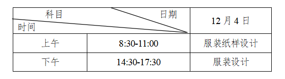 考试所需绘画工具、剪裁工具等自备。服装工艺考试具体时间、地点详细安排由考点另行公布,服装设计、服装纸样设计考试时间统一安排如下: