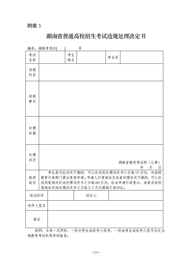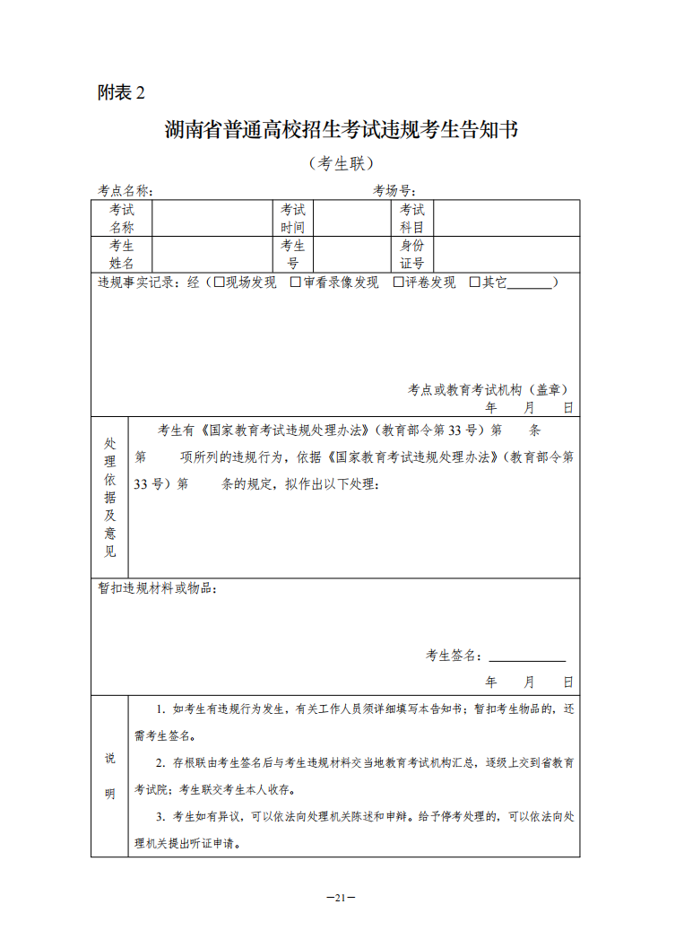 2.湖南省普通高校招生考试违规考生告知书(考生联)