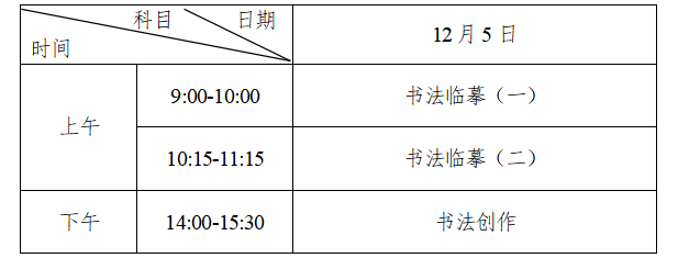 书法艺术和书法教育类考试全省考生随机编排在长沙市内若干考点,具体考试地点安排见《专业考试证》。考生须在考试前3天开始登录“报名缴费指定系统”打印《专业考试证》,12月4日下午17时-18时期间考生可前往考试地点熟悉笔试考场,但不能进入考室。考生必须凭第二代居民身份证以及《专业考试证》在规定的时间和地点参加专业考试。考试时间具体安排如下: