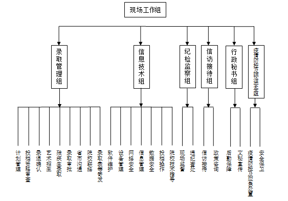 各工作组要针对录取过程中可能出现的各种情况和问题,制定应急预案,确保一旦出现异常情况和突发问题能快速反应、妥善处置。在遇到突发问题时必须第一时间逐级上报,并在录取现场协调处置小组统一指挥下启动应急预案,采取紧急措施。