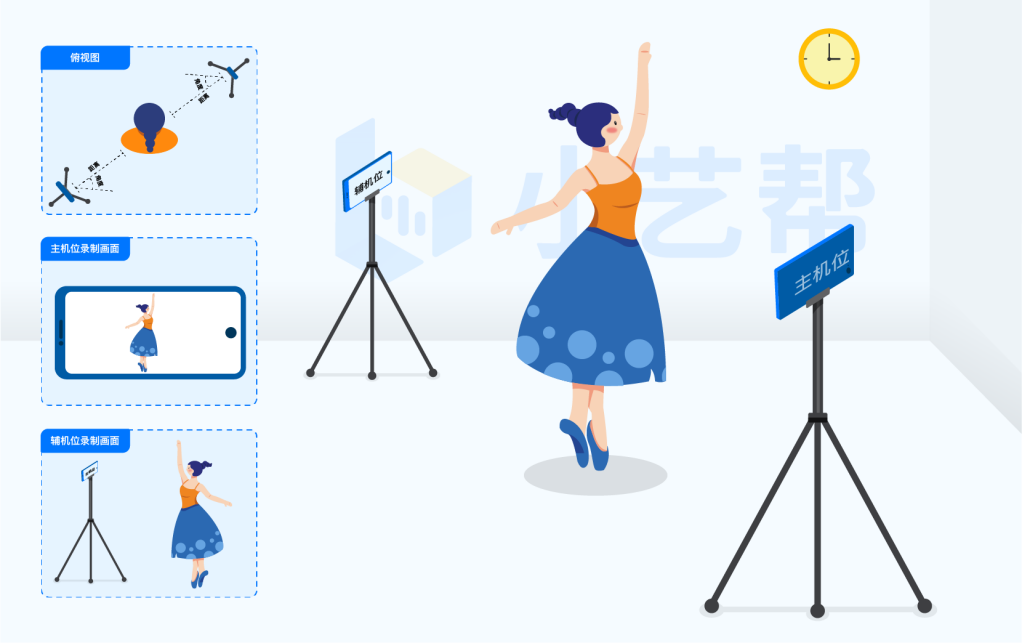 请按学校要求,提前架设好主机(小艺帮app)和辅机(小艺帮助手app)(摆放方法参照下方双机位摆放示意图),进入正式考试后,辅机先扫描主机位二维码,开启辅机位录制(小艺帮助手app为辅机位)。考试各科目有3次录制机会,录制按钮上会显示录制次数。每个科目只能提交1个视频,无须使用全部的录制机会。科目录制完毕后,可查看视频,并选择最合适的1个视频在考试时间截止前提交上传,作为考试视频。