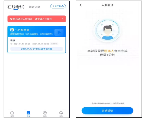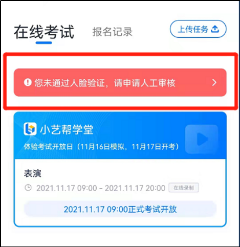 首次视频考试前需要进行人脸验证,注意【报考】页面屏幕上方红色条,点击开始验证,按提示进行人脸验证,验证完成后方可参加考试。根据语音提示进行人脸识别,不要化浓妆、戴美瞳等,验证时调整好光线,不要出现高曝光的情况,保证人脸清晰,避免人脸识别失败。若多次人脸验证失败可以申请“人工审核”,请耐心等待人工审核结果。