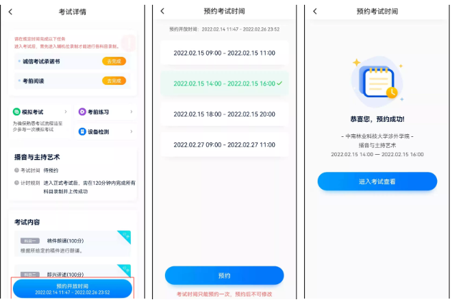 我校广播电视编导、播音与主持艺术、摄影专业会要求学生预约考试时间。在【考试详情】页面下方会显示【预约开放时间】按钮。请在开放时间内,选择一个考试场次,如错过预约开放时间则无法选择考试场次,不能进行正式考试。预约成功后,请务必记住选择的考试场次时间,准时参加考试。下图仅为示意,并非实际考试时间。