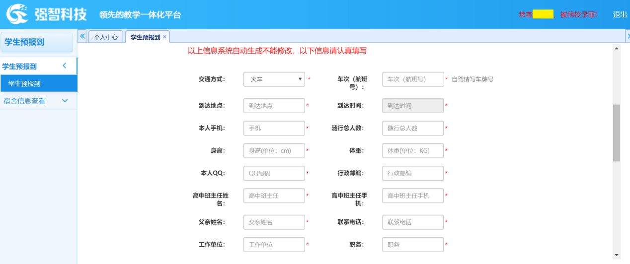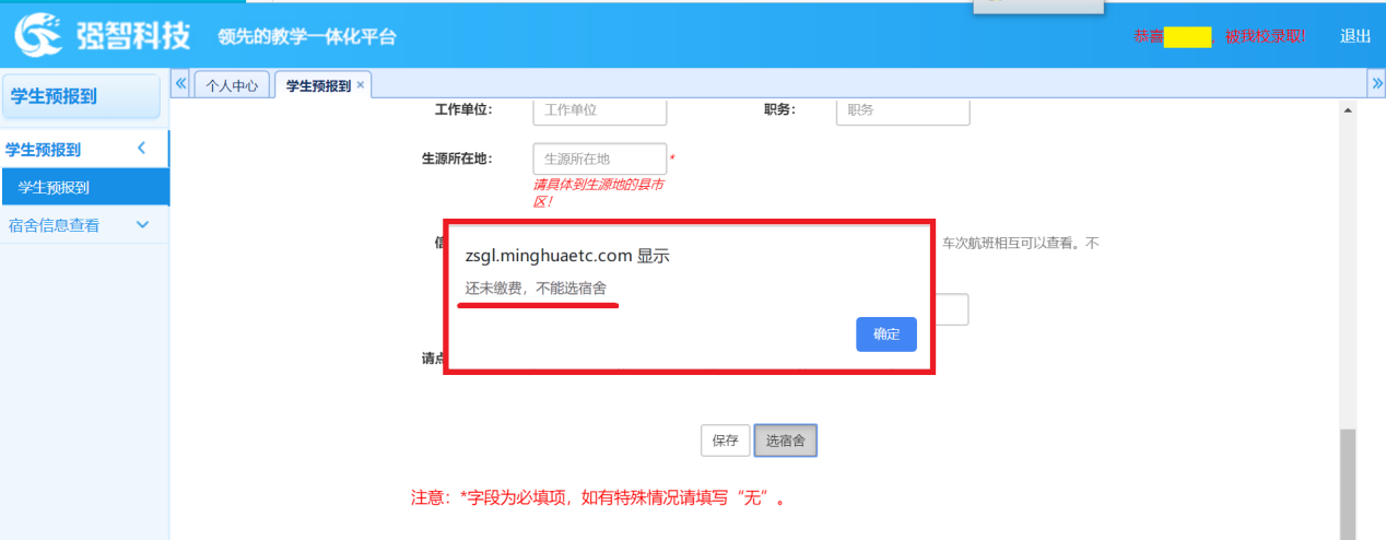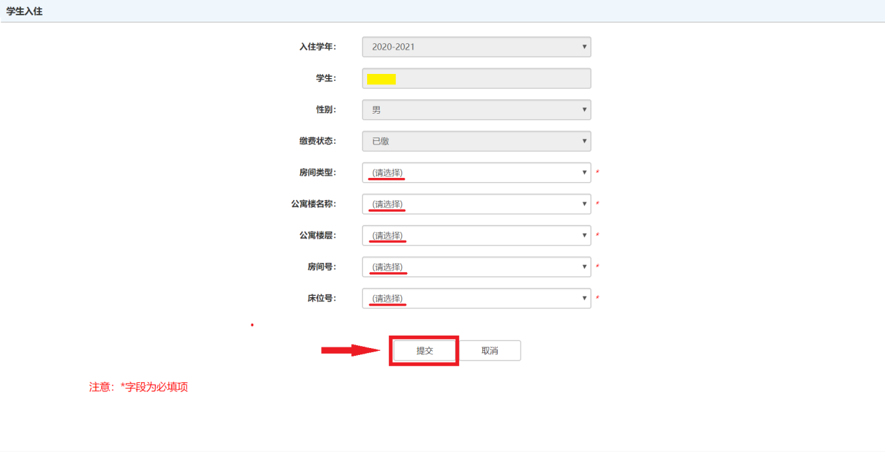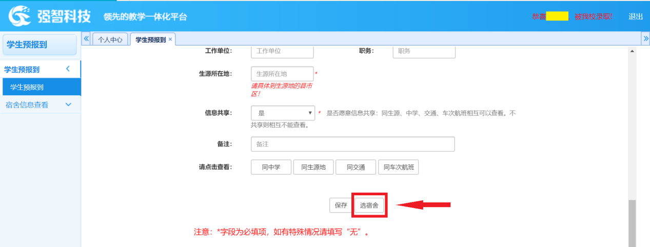 除系统自动生成信息外,请将所有带*号的内容填写完整并保存后,点击选宿舍按键
