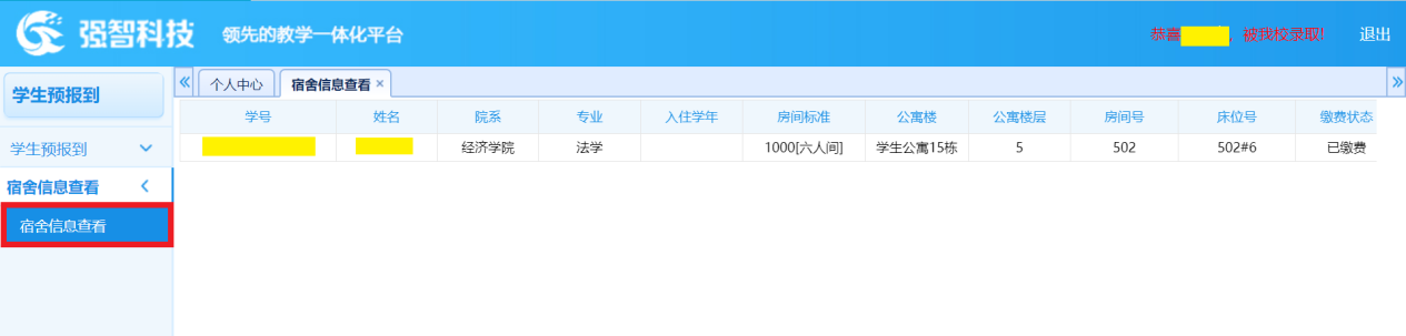 在系统可选的时间内,选择完宿舍并提交后,可进入宿舍信息查看页面浏览所选宿舍信息