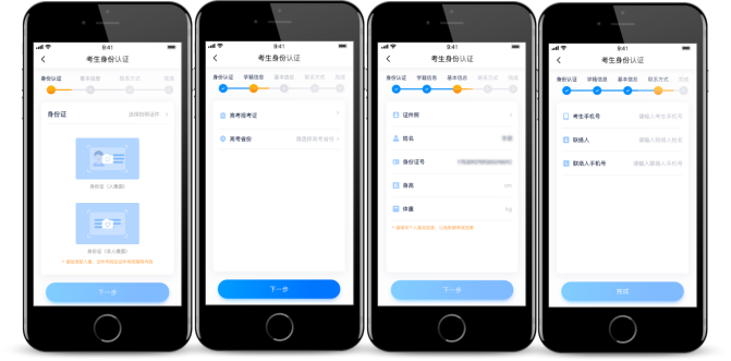 3.认证。首次报名需要认证考生信息,建议考生提前完成认证。认证免费,认证后不可更改信息,请考生慎重仔细填写!考生根据自己的证件选择拍照证件类型(身份证、通行证、护照),下图示例为身份证上传界面,进入基本信息页填写个人基本资料,需准备一张一寸免冠照,填写紧急联系方式,即可完成认证。