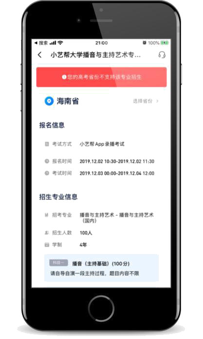(2)专业报名:点击需要报考的专业,进入报考专业页面,包括该专业的招考省份、报名时间、考试时间、考试科目、报考要求等,请考生谨慎详细阅读,避免影响高考报名录取。